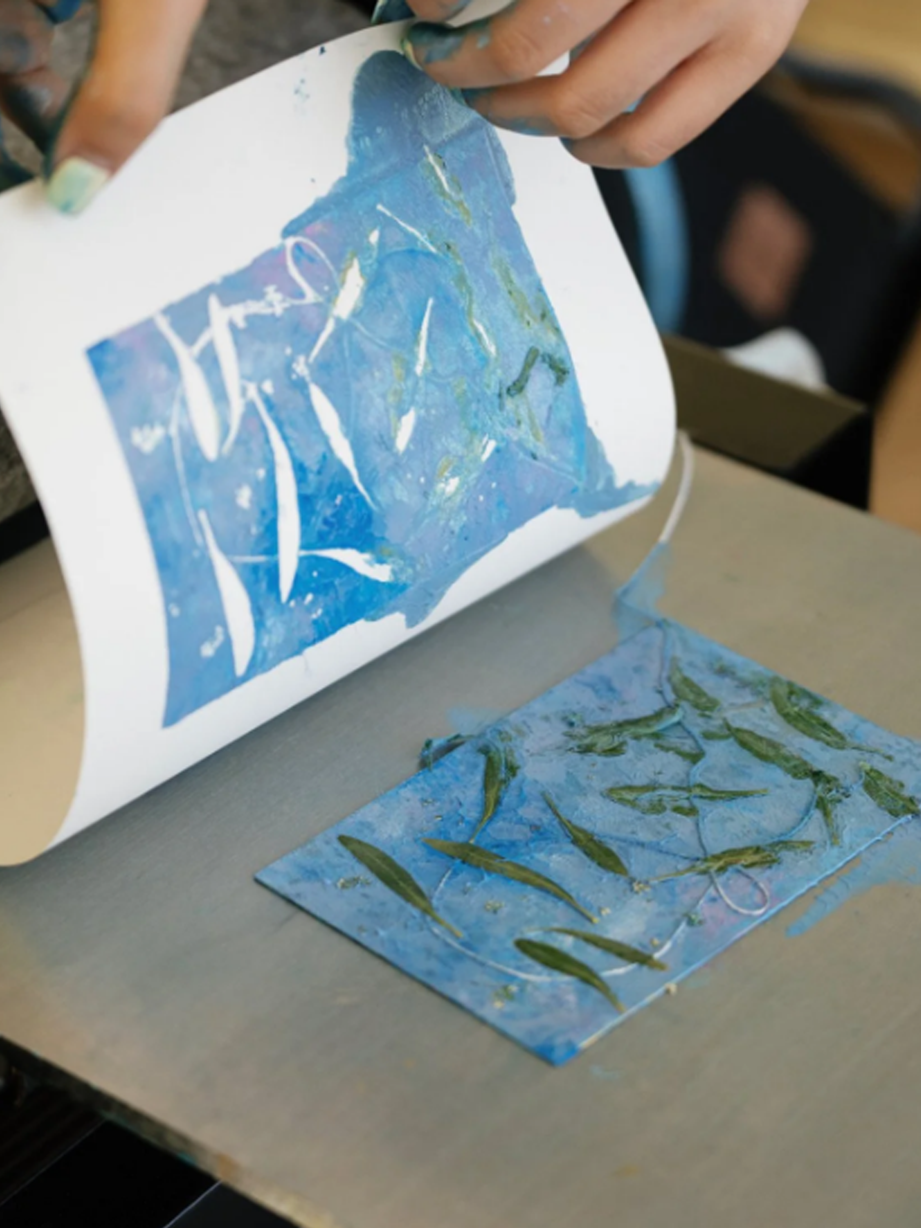 午后金色的阳光在沙漠上投下长长的影子,我们的学生聚集在一起,参加一个融合艺术、生态和想象力的工作坊。灵感直接来源于这片土地:早上,学生们来到沙地上采集植物,每一种植物都展现着沙漠生命脆弱的质感和顽强的生命形态。 这些植物包括梭梭树(Haloxylon ammodendron),一种耐寒灌木,能够稳固沙丘并固定土壤;白刺(Nitraria tangutorum),一种耐盐植物,能够在恶劣环境中茁壮生长;以及肉苁蓉(Cistanche deserticola),一种寄生在梭梭树根部的珍稀药用植物,象征着沙漠生态系统中微妙的相互依存关系。一些学生甚至在梭梭树的枝条上发现了缠绕的骆驼毛,这是一个虽小却意义重大的迹象,表明野生动物正在逐渐回归这片土地——生态修复正在进行中。 他们以这些天然材料为载体,开启了创作之旅。从精细的叶片纹理到醒目的茎干轮廓,从色彩的交融到构图的精妙平衡,每一步都是对观察和表达的实践。这些沙漠植物,曾经是这片脆弱生态系统的沉默见证者,如今化作生机勃勃的印花——讲述着生存、适应和美丽的视觉故事。 每一件艺术作品都不仅仅是审美创作,更是学生们与自然环境对话的鲜活记录。这些版画捕捉了沙漠植物的精髓,将科学的好奇心转化为艺术的诠释。对许多参与者而言,这是他们第一次体验到自然如何既成为艺术的主题,又成为艺术的媒介。 工作坊结束时,帐篷里摆满了琳琅满目的色彩和纹理,每一幅版画都承载着创作者的独特风格和土地的灵性。这些作品不仅仅是艺术品,更是共同旅程的个人印记,体现了创造力如何加深我们对生态的理解,并加强我们与自然世界的联系。