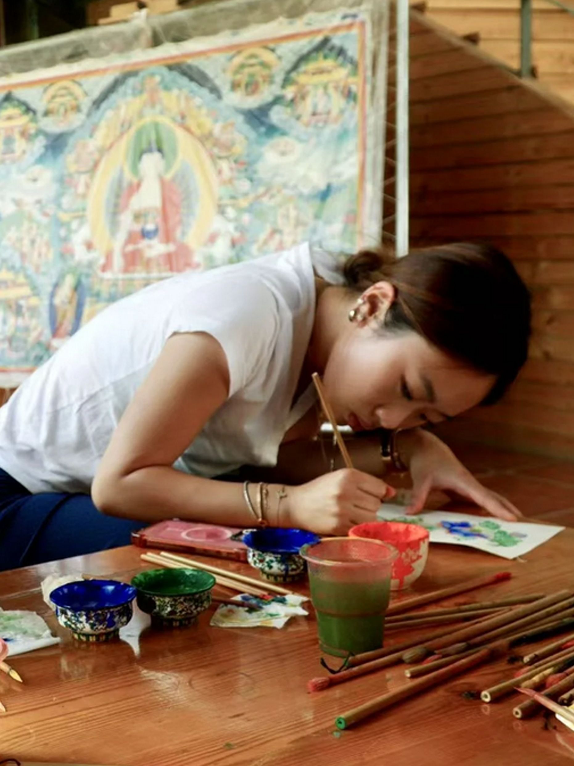 暑期研究项目同样着重引导学生理解文化与艺术的多元表达。除了参与梭梭树种植与肉苁蓉采摘等生态体验,学生们还走进唐卡艺术课堂,沉浸式学习这门深植于藏族文化与精神传统的独特绘画形式。 什么是唐卡? 唐卡是藏族传统的卷轴绘画,融合了宗教象征、故事叙述和精湛的艺术工艺。每一幅唐卡都由工匠手工绘制在棉布或丝绸上,使用色彩鲜艳的矿物颜料。这些艺术品不仅具有装饰性,更蕴含着丰富的精神内涵,通常描绘佛教神祇、曼荼罗以及人与自然和谐共处的场景。 在耐心与精准中学习的艺术旅程 在一位经验深厚的当地艺术家的指导下,学生们循序学习唐卡绘画的基础技法——从画布的细致准备,到神圣几何线条的勾勒,再到天然矿物颜料的层层上色。每一步都要求高度的专注、极大的耐心,以及对传统工艺的敬意。 对许多学生而言,这是他们首次接触与文化身份和哲学思想紧密相连的艺术形式。课程也因此引发了关于艺术如何承载生态价值的深入讨论,让学生更加理解:土地修复不仅是一门科学,更是一项深具文化意义的实践。