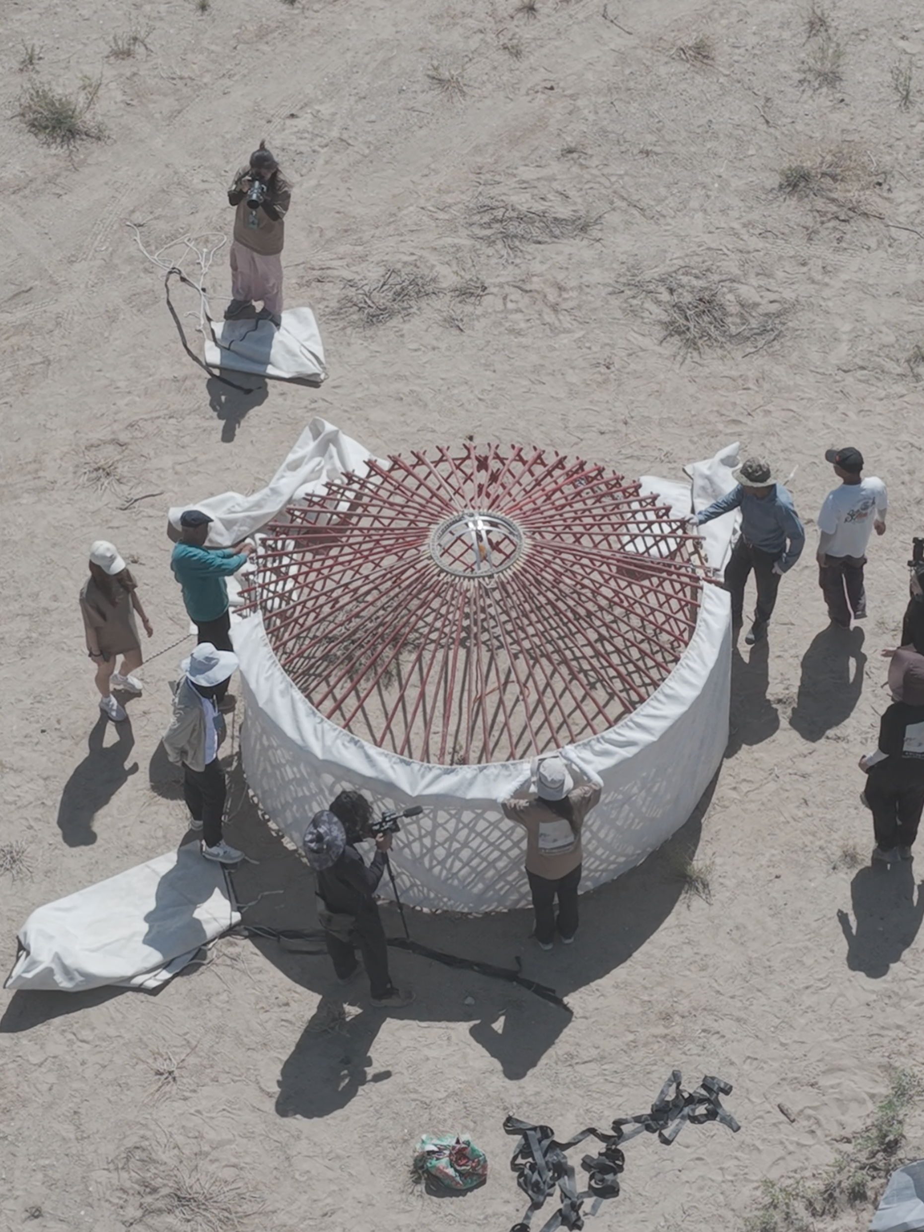 搭建蒙古包:在风中学习结构、文化与协作的力量 在青海沙漠的开阔地带,风从远山吹来,卷起松软的沙粒。学生们围成一圈,在当地蒙古族老师的指导下,开始了一项与土地、文化和建造智慧紧密相连的实践——搭建蒙古包。 蒙古包不仅仅是一种住所,它凝结着游牧民族千百年来在极端环境中积累的智慧。可折叠的墙架、放射状的木梁、中央的轮形顶圈,每一处结构都回应着强风、昼夜温差和迁徙的需要。学生们第一次触摸到这些被红色涂料染过的木构时,能清晰感受到一种介于工艺与工程之间的节奏。 在老师的手势指引下,墙架一点点展开成圆形。 有人扶住结构,有人系紧绳索,也有人站在中央举起沉稳的“轮圈”,等待木梁一根根搭接其上。在烈日下完成这一动作并不轻松,但每个学生都在尝试找准自己的位置,确保木结构能够均匀受力。顶圈被稳稳托起的那一刻,风吹过梁木发出的轻响仿佛成为共同协作的回声。 当白色的外毡缓缓铺上骨架,蒙古包的轮廓逐渐显现。学生们围在四周,拉紧布边、固定绑带,让柔软的布料与坚硬的梁木完美贴合。无人机从空中拍下的画面中,圆形的结构像是大地上的白色种子,象征着在沙漠中扎根的一个瞬间。 搭建过程不仅是体力劳动,更是一次关于结构逻辑、传统知识与生态适应的深度课程。学生们意识到,这种建筑之所以能在荒漠环境中屹立百年,是因为它理解风、顺应风,并最终与风共处。 当蒙古包完全成型,伫立在金色沙地上,四周是连绵山脉与广阔天空。学生们退后几步,看着自己的作品,很难不感到一种来自身体与土地同步的成就感。 这里的每一个动作——托举、绑绳、拉绳、合拢布面——都记录了人与自然之间最古老也最朴素的对话。