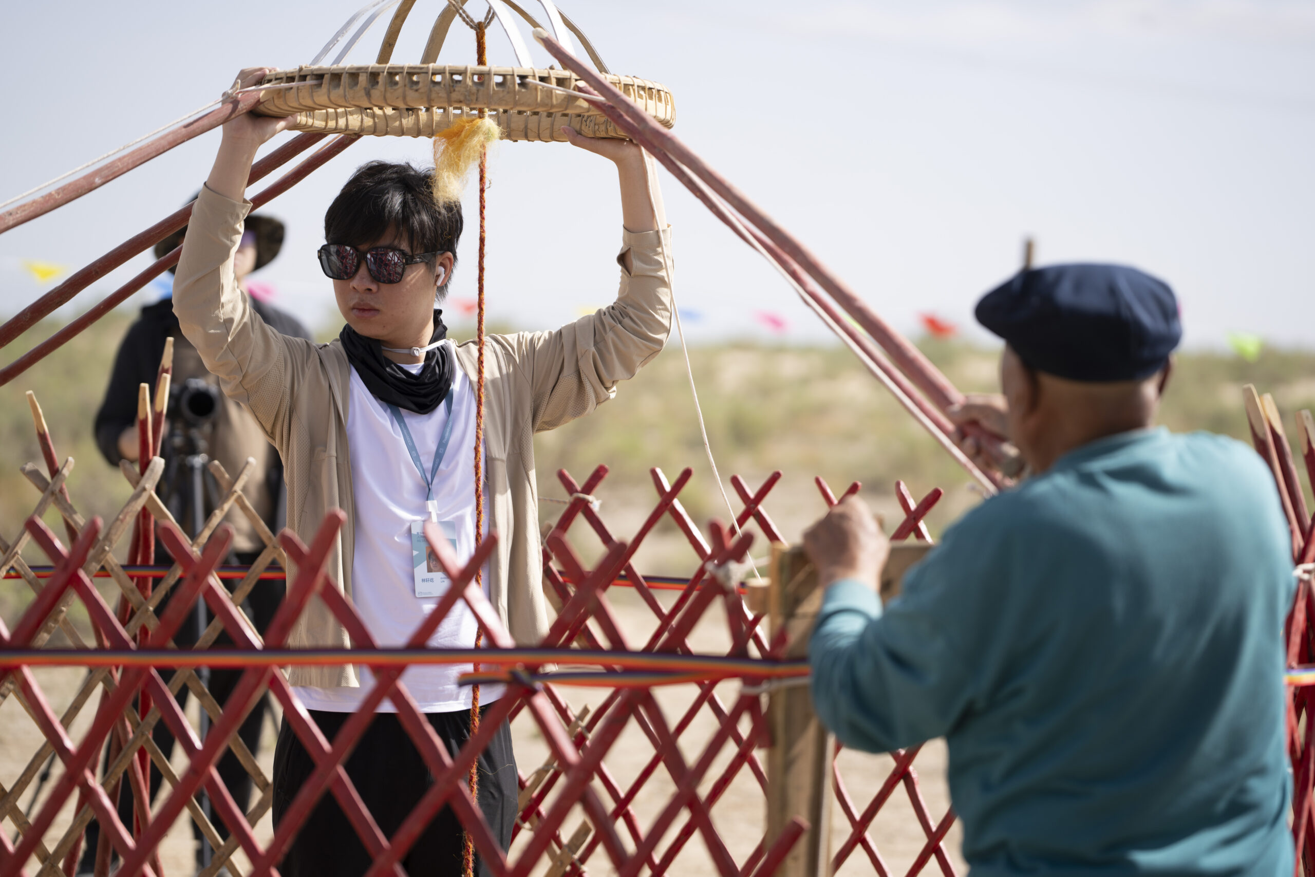 在青海沙漠的开阔地带,风从远山吹来,卷起松软的沙粒。学生们围成一圈,在当地蒙古族老师的指导下,开始了一项与土地、文化和建造智慧紧密相连的实践——搭建蒙古包。