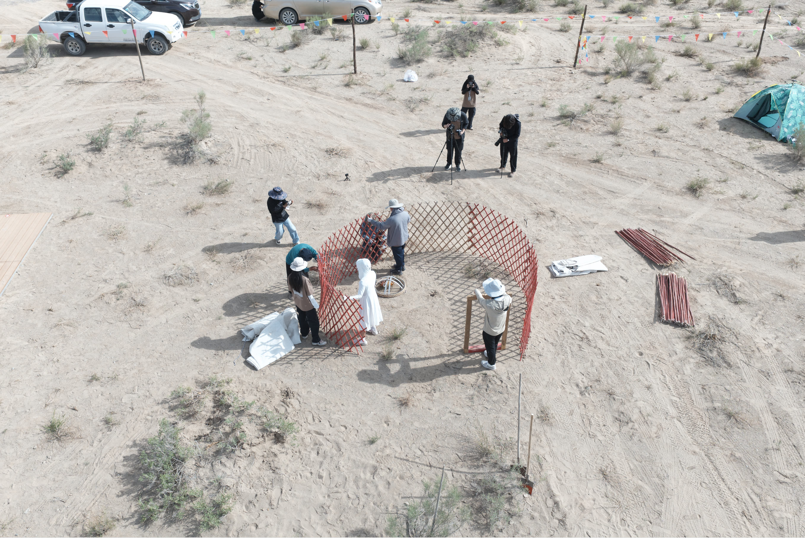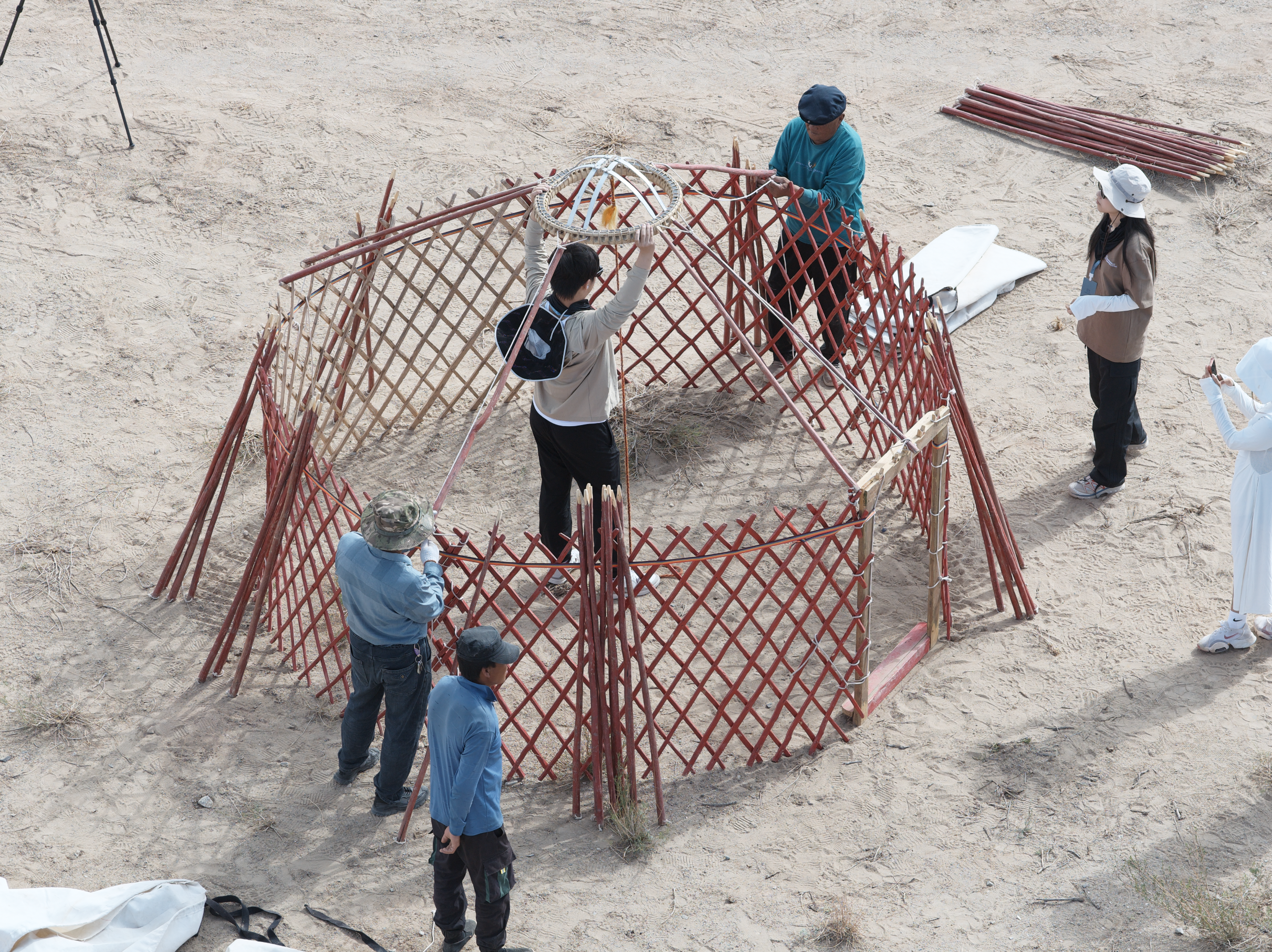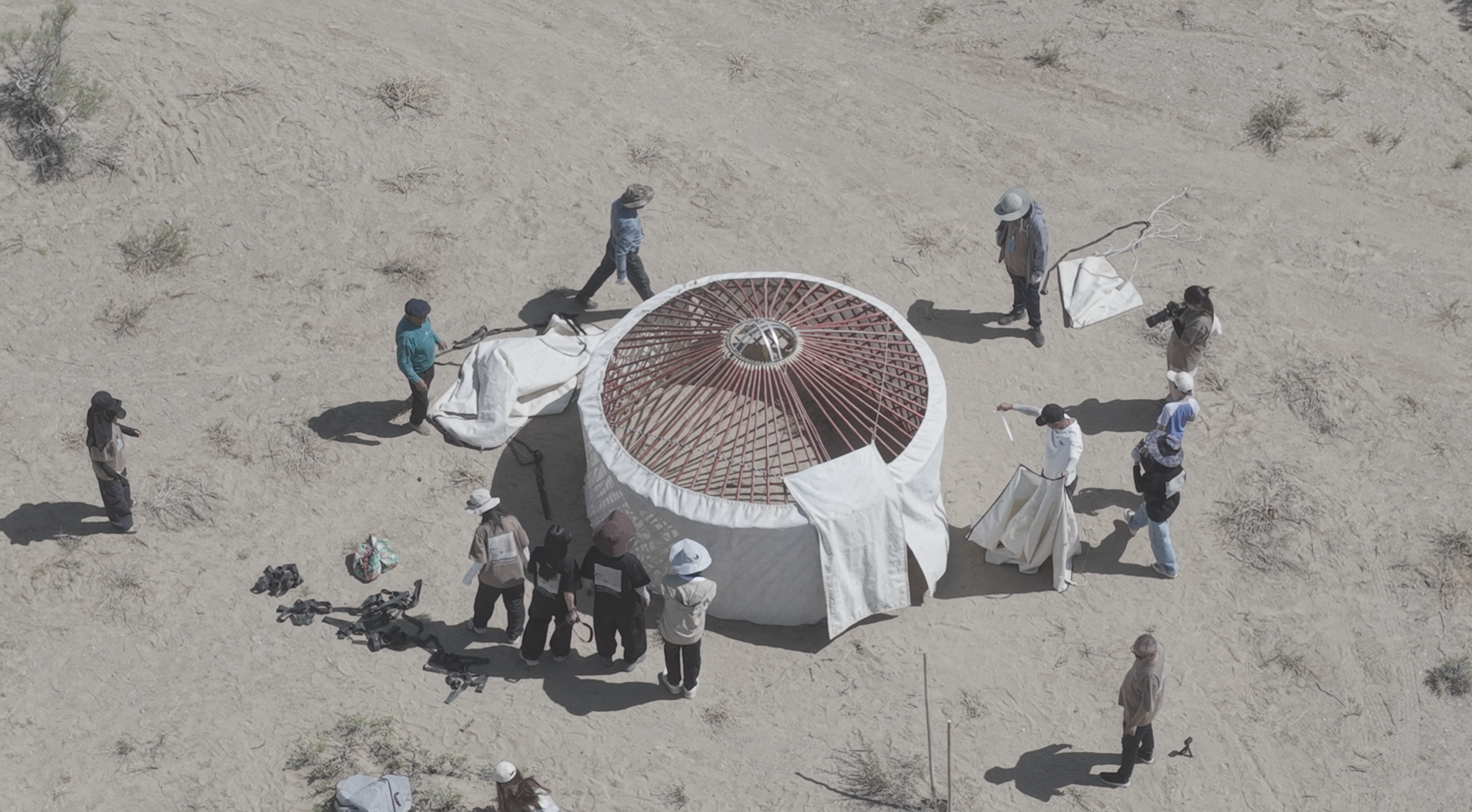 当白色的外毡缓缓铺上骨架,蒙古包的轮廓逐渐显现。学生们围在四周,拉紧布边、固定绑带,让柔软的布料与坚硬的梁木完美贴合。无人机从空中拍下的画面中,圆形的结构像是大地上的白色种子,象征着在沙漠中扎根的一个瞬间。