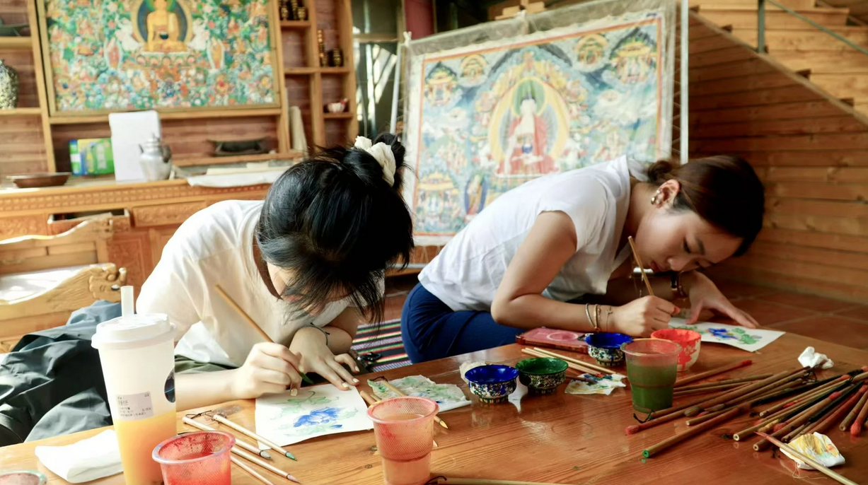 在一位经验深厚的当地艺术家的指导下,学生们循序学习唐卡绘画的基础技法——从画布的细致准备,到神圣几何线条的勾勒,再到天然矿物颜料的层层上色。每一步都要求高度的专注、极大的耐心,以及对传统工艺的敬意。